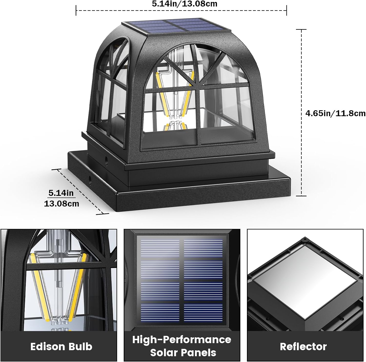 - [Edison LED Bulbs] Crafted from sturdy ABS, this outdoor solar post cap light is adorned with a chic design and vintage warm white Edison bulbs, infusing a touch of romance into your surroundings. With its user-friendly nature, there's no need for intricate wiring or manual toggling – pure simplicity.