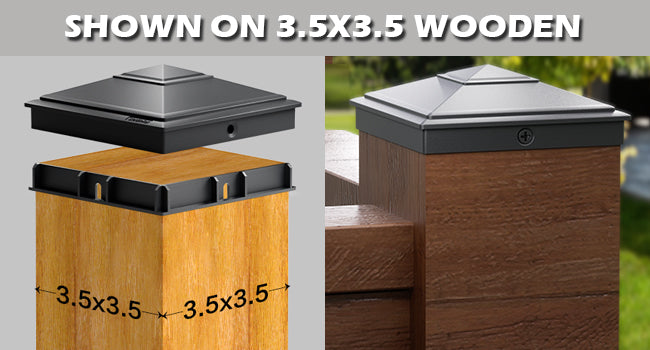 - [Wooden or Vinyl] Designed to snugly fit both 3.5x3.5 (3-1/2" x 3-1/2") wooden posts and 4x4 vinyl posts. These functional yet decorative 4x4 post caps are an excellent choice for anyone looking to improve the longevity and appearance of their outdoor structures.